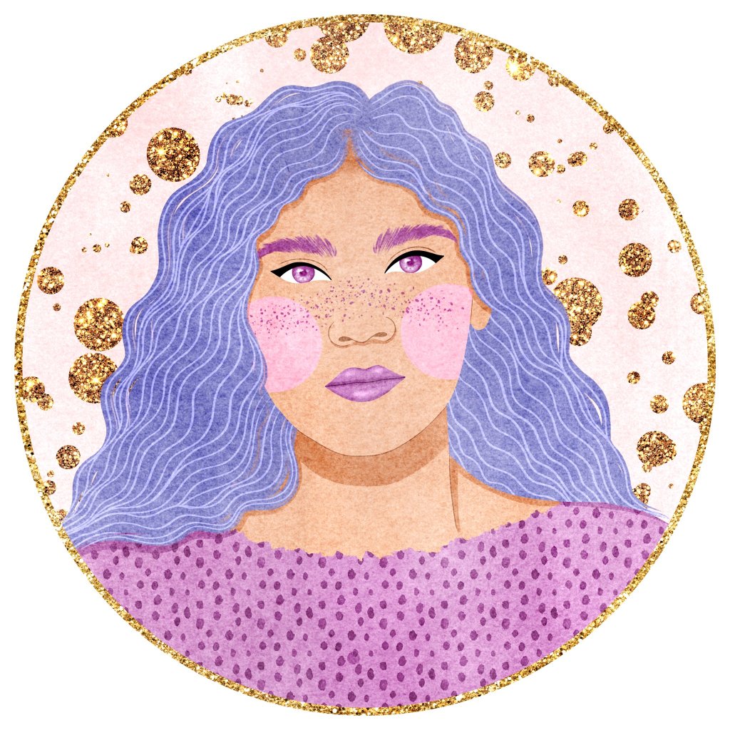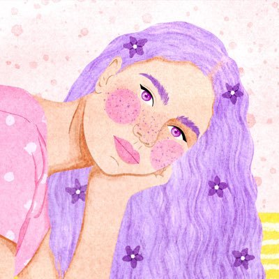 The freckles, the closed eyes, the pink lips, the round nose, the wavy purple hair, the floral dress, the pink eyelashe, and the pink background color!