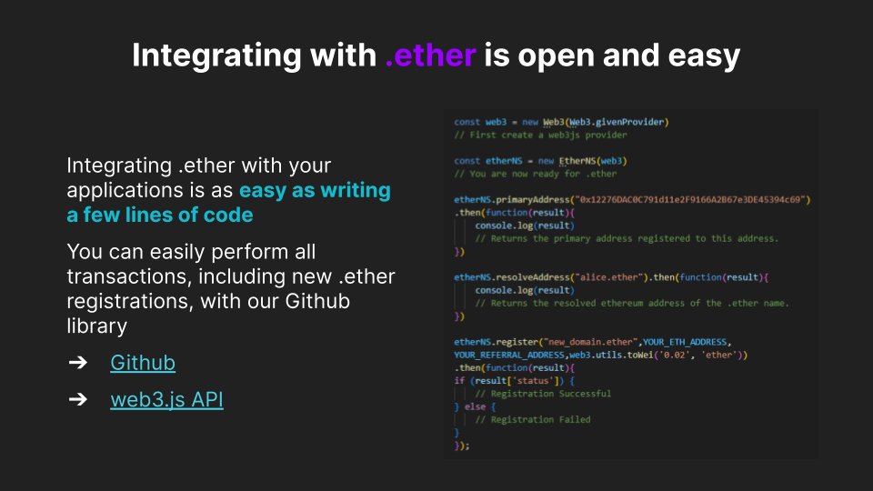 ether.domains is only step one. In addition to the domain registry, we’re also building out ether.market, an enhanced analytics UI and marketplace, as well as ether.network, a new concept that will allow .ether holders to develop their own token-gated subdomain communities.