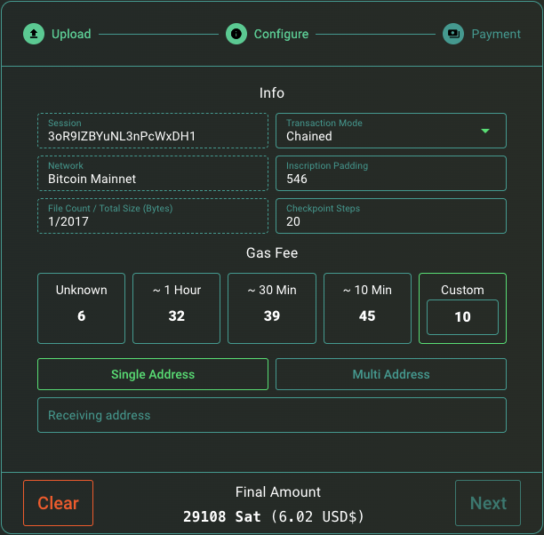 Chained Mode – From your unconfirmed transactions we create reveal transactions that go into other reveal transactions. We add the gas fee on the final transaction step. This ensures your transactions get minted all at once and you get consecutive numbers. This also means there is no commit (or that your payment tx is considered the commit). There is a limit of 25 ancestors/descendants and to handle some edge cases we reduced this to 20 currently. There is also a limit of 400kb per group of transactions so in such a case you would play with the config settings so that each group is below 400kb (don’t worry it will error out if your tasks are complex and you did not make correct settings. Once a group is minted the next group is broadcasted to the network. The first group is sent as soon you send your payment, no need to wait, instant network broadcast. There is no limit to how many you can mint with this more.