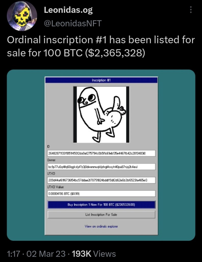 Ordinal Inscription 1 is a Dickbutt now listed for sale for 100 BTC. What are your thoughts on this? Do you think one day places like Sotheby’s will auction off the Dickbutt inscription #1 as a unique cultural artwork?