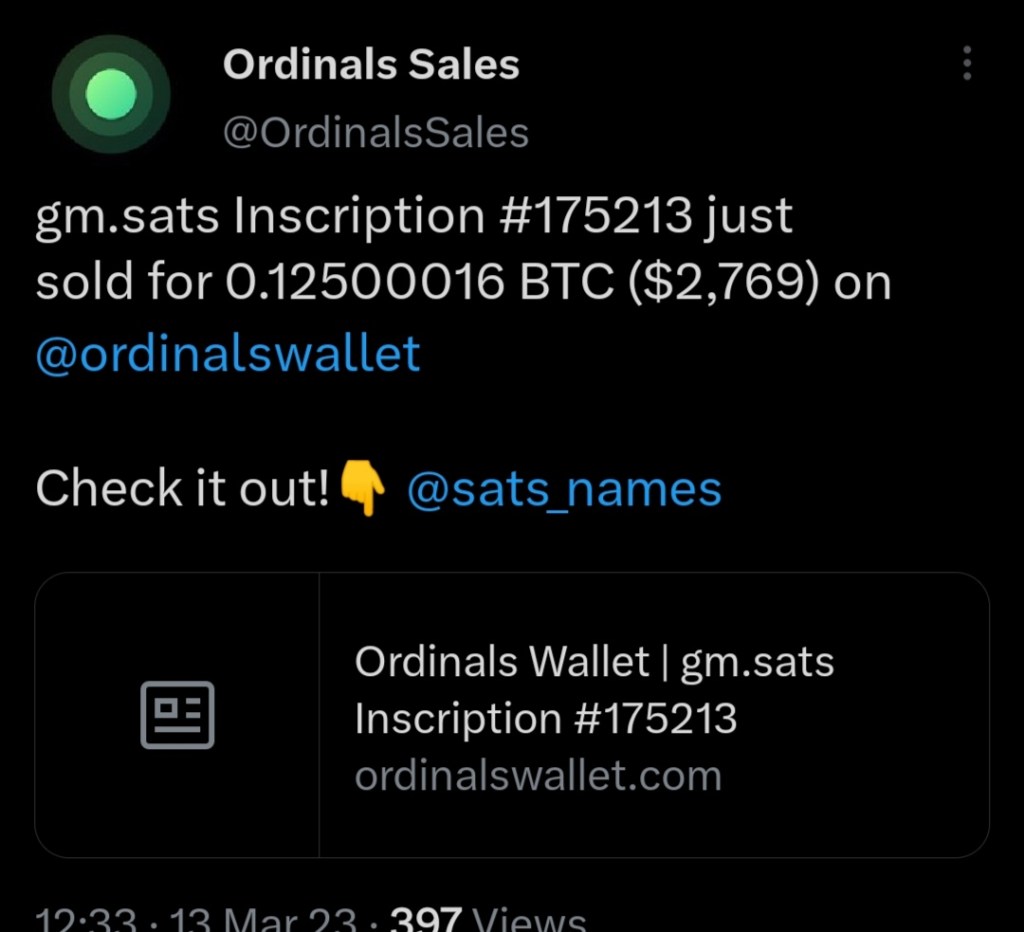 With the purchase of gm.sats you have made the single largest .sats name purchase in #Bitcoin #Ordinals history to date as of Monday 13 March 2023. How are you feeling about your acquisition?