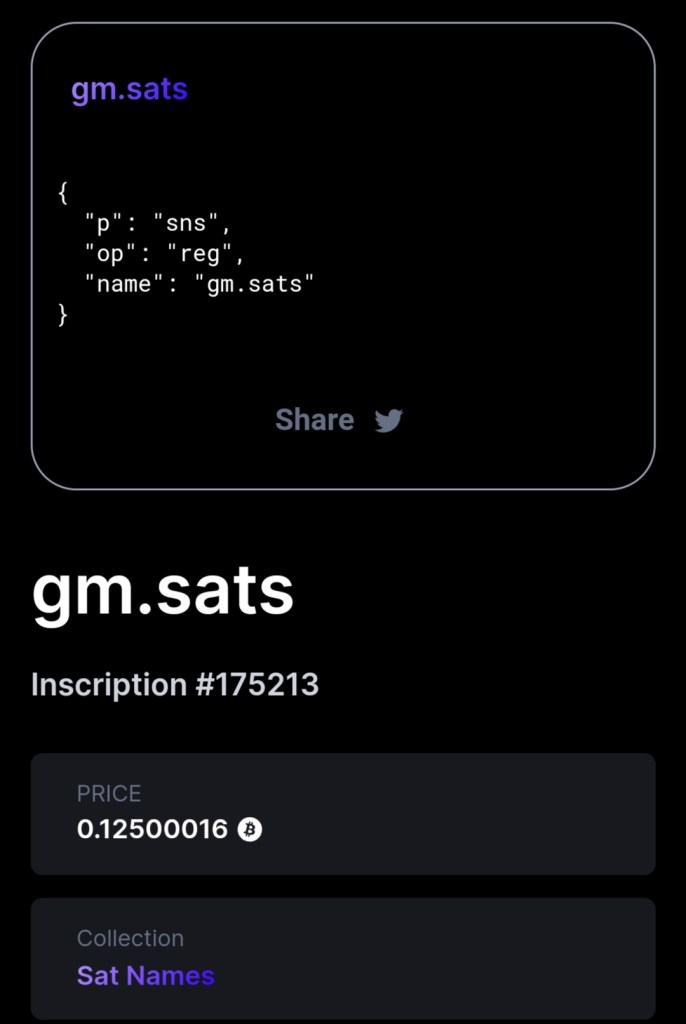 I do believe Ordinals Wallet is the current leading platform for sat names as they have a good overview available of the inscriptions. You can even rank .sats names from lowest to highest inscription for example. That’s how I came accross gm.sats as it was the second lowest inscription for sale there. A hefty price on a first look, but for me it was a no-brainer. I see it as the biggest bargain in Ordinals to this day.