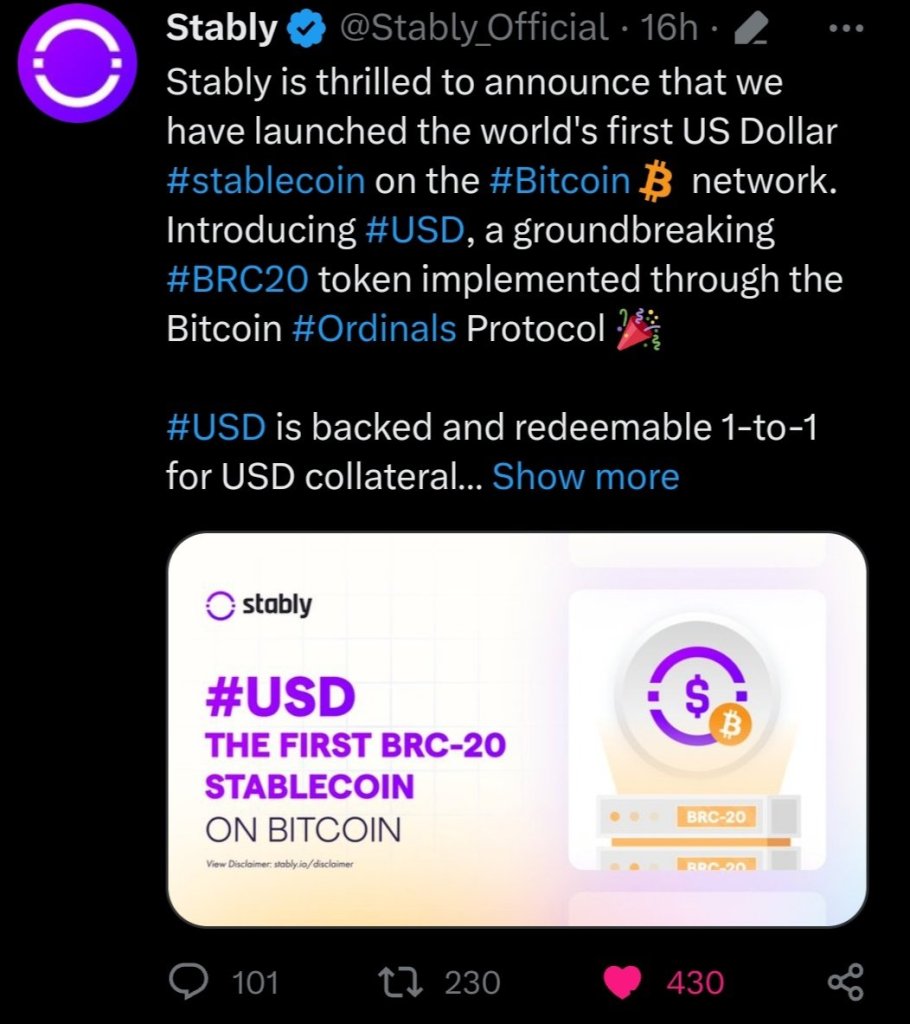 Today Stably Launches #USD as the First BRC20 Stablecoin on the Bitcoin Network.
