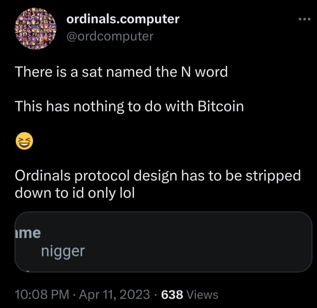On January 23, 2023 Lounès Ksouri @louneskmt tweeted,”Is it just me or are they censoring some Ordinals on their explorer? A nude GIF used to be displayed here” - Exclusive Interview with Ordinals.Computer about a Sat named the N-Word and Thoughts on scrapping #Ordinals Inscription numbers @ordcomputer